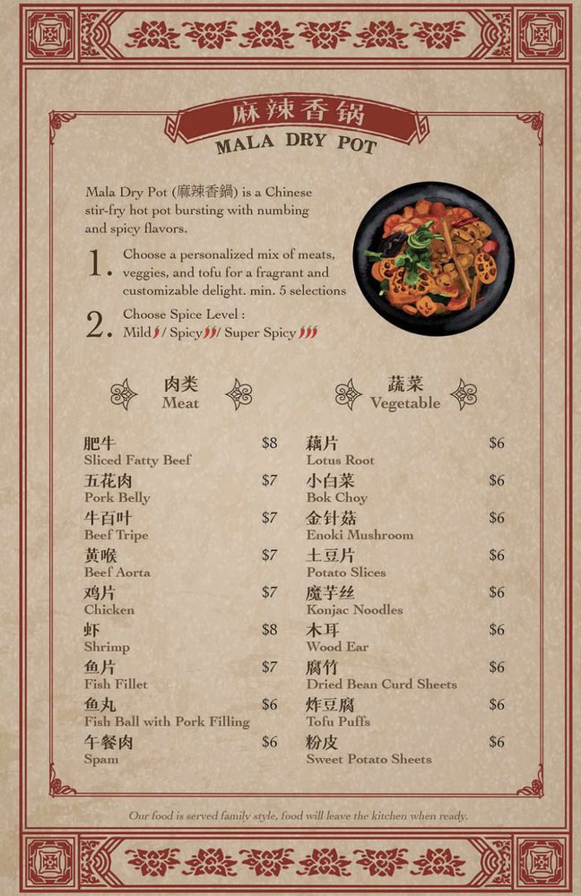 Mala Dry Pot () is a Chinese stir-fry hot pot bursting with numbing and spicy flavors.1. Choose a personalized mix of meats, veggies, and tofu for a fragrant and customizable delight. min. 5 selections2. Choose spice level (mild, medium, spicy)