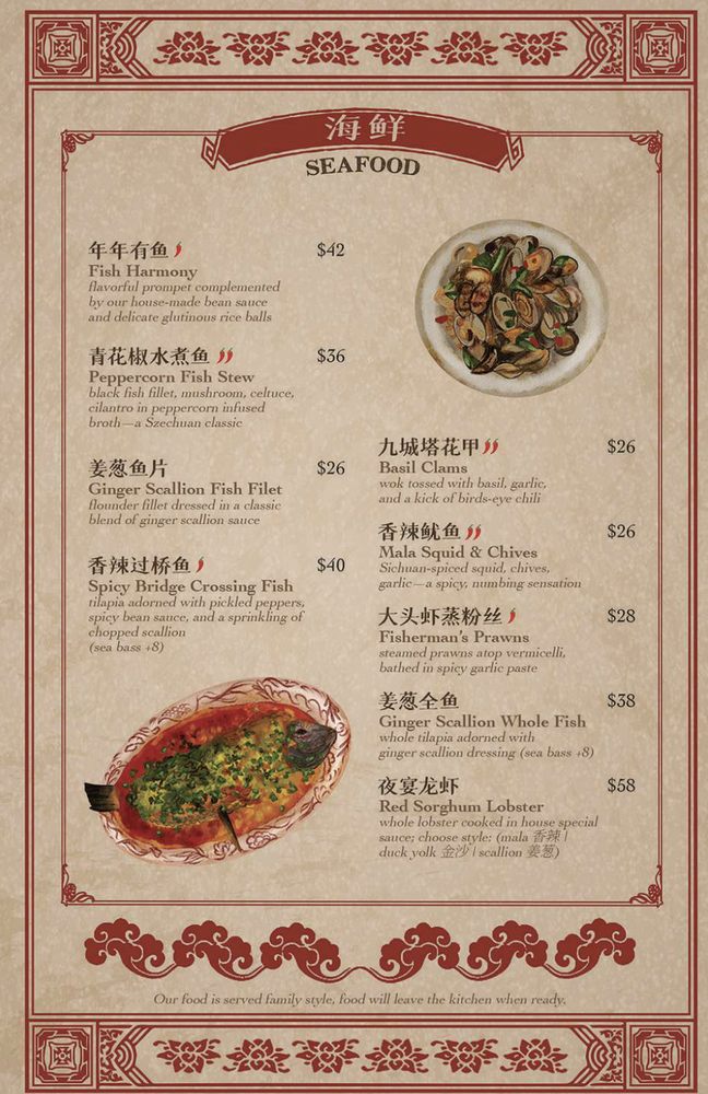 black fish fillet, mushroom, celtuce, cilantro in peppercorn-infused brotha Szechuan classic